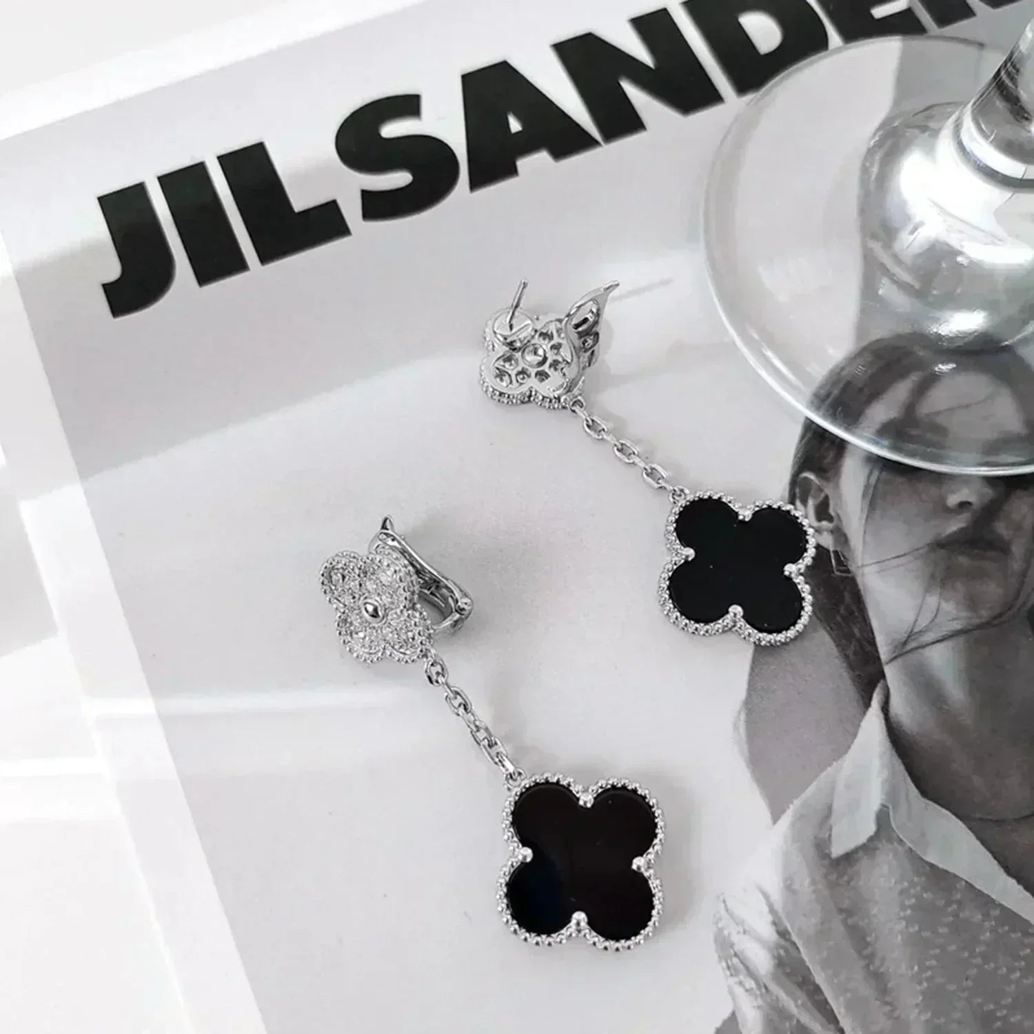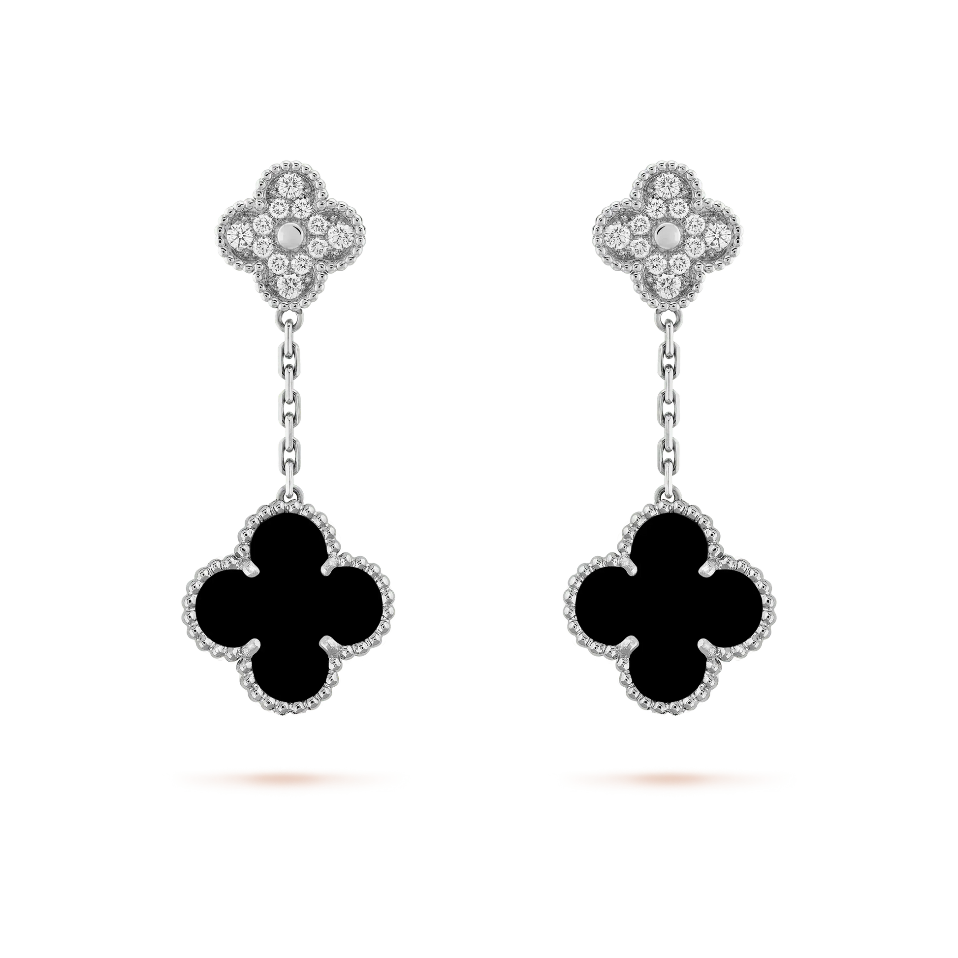 [Raffine]CLOVER 2 MOTIFS DIAMOND ONYX EARRINGS SILVER